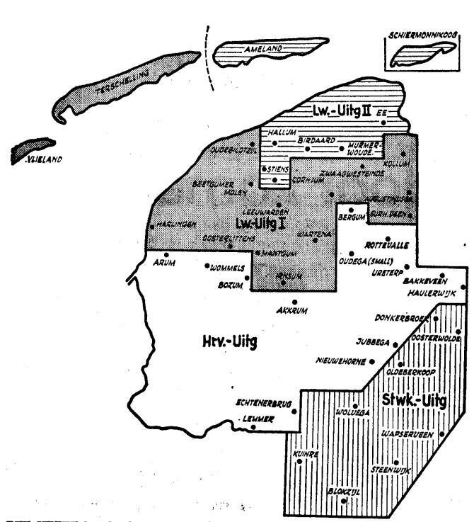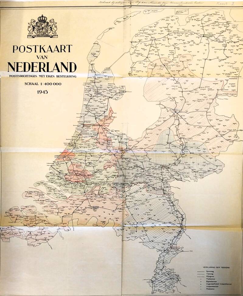De Postkaart van Nederland. Postinrichtingen met een eigen bestelkring. De kaart is van 1945. Bron: Nationaal Archief
