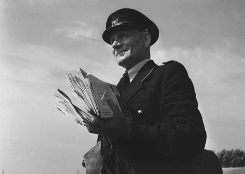 Postbode P.J.Meijer in Amsterdam 1954. Naast het prachtige uniform valt op het aantal nieuwsbladen dat hij in handen heeft. Dat was een grote kostenpost voor Post.