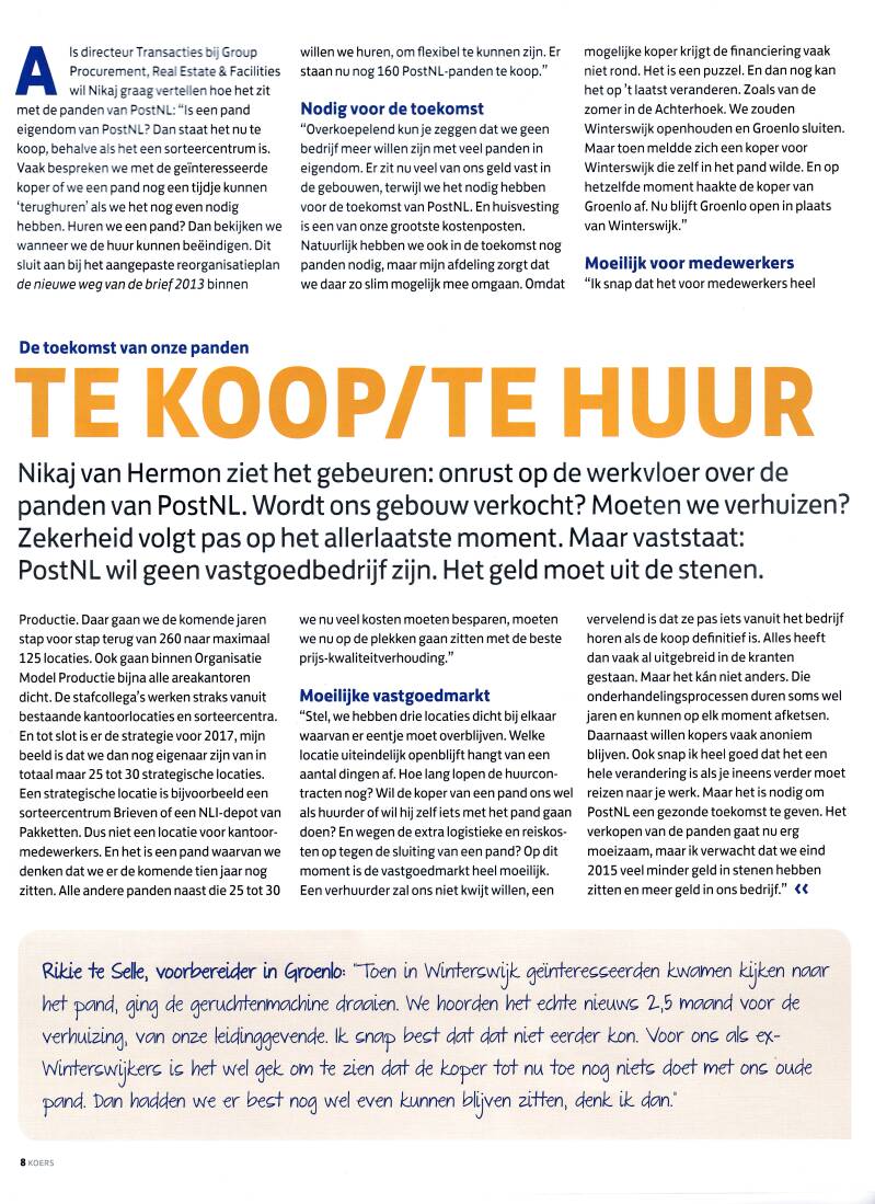 In Dichtbij van december 2013 vinden we een interview met Nikaj van Hermon. De man die de panden van PostNL gaat verkopen. Stap voor stap gaan we terug van260 naar maximaal 125 locaties. En in 2017 naar 25 tot 30.