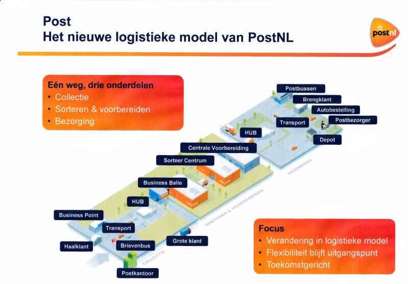 In de afbeelding is de structuur van het logistieke model geschetst. In het collectieproces wordt de nadruk gelegd op het halen van post bij klanten en het aanleveren op de businessbalies van de sorteercentra. Voor de kleinere zakelijke klant blijven er Business Points, waar ook de postbussen komen te staan. Transport wordt uitgevoerd vanuit een (nieuwe) Transportorganisatie die al het transport regelt, ritten worden uitgevoerd vanuit dertig hubs, verspreid over het land. De sorteerprocessen zowel van brievenbuspost als van partijenpost worden uitgevoerd op één van de zes Sorteer Centra. Vervolgens wordt de post naar een van de negen Centrale Voorbereidings Locaties (CVL) vervoerd per vrachtwagen. Aldaar wordt de post (bijna volledig) door machines gesorteerd op wijk en worden de bundels voor de tassen van de postbezorgers gereed gemaakt. Per vrachtauto gaat de post dan weer naar een hub van de transportorganisatie. Vervolgens worden de 2500 depots (garageboxen e.d.) bevoorraad waar de postbezorgers komen om hun tassen af te halen en daarna hun post die al op de goede volgorde staat te bezorgen.