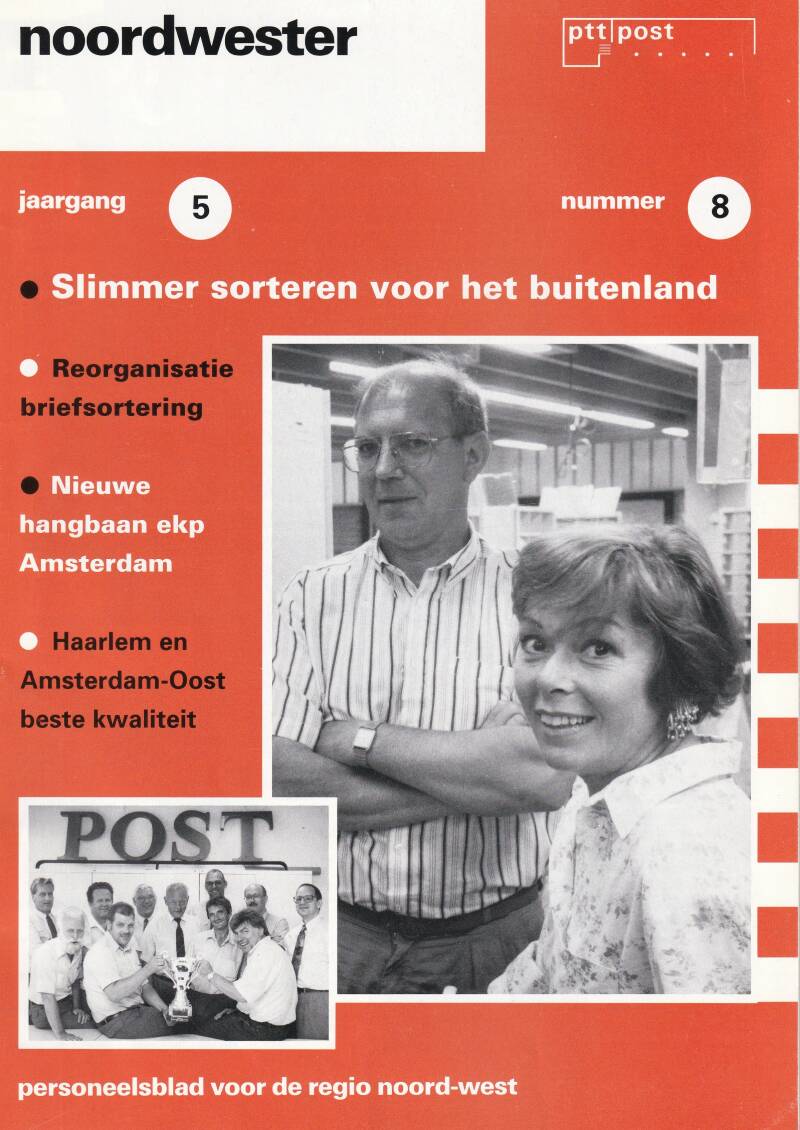 “Dinsdagavond 23 juni, 19.00 uur. Het bedrijfsrestaurant van het expeditieknooppunt aan de Westergracht in Haarlem is volgelopen. Hier en daar hoor je wat gemopper: “Ik hoop niet dat het lang gaat duren. Mijn werk ligt stil.” Niemand weet dan nog dat tien minuten later één van de grootste reorganisatie in de geschiedenis van PTT Post zal worden aangekondigd. Vanaf een groot videoscherm deelt de directeur van PTT Post, de heer A.J. Scheepbouwer, mee dat zes expeditieknooppunten verdwijnen. De zaal houdt de adem in. Zit Haarlem er bij? Ja. Verbazing en teleurstelling is op de gezichten in de zaal te lezen.”