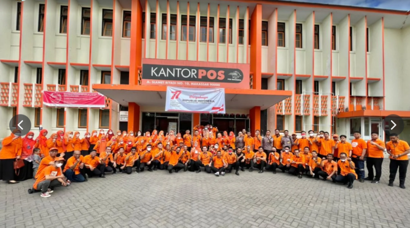Boven en rechts het Kantor Pos van Makassar. Adres Jalan Selamet Riyadi 10. De foto boven lijkt het meest of een personeelsfoto. Ook hier is oranje de bedrijfskleur.
