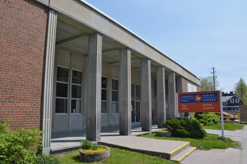 De buitenkant van het postkantoor van Port Hope met indrukwekkende zuilen.