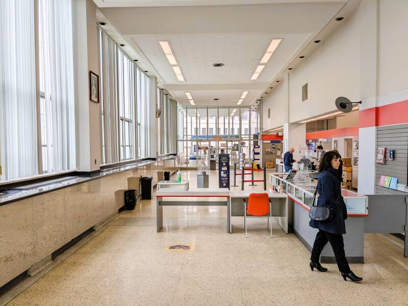 Impressies van het postkantoor van Kingston. Het gebouw, postbussenfront, publiekshal met loketten en de kaart met postcodes.