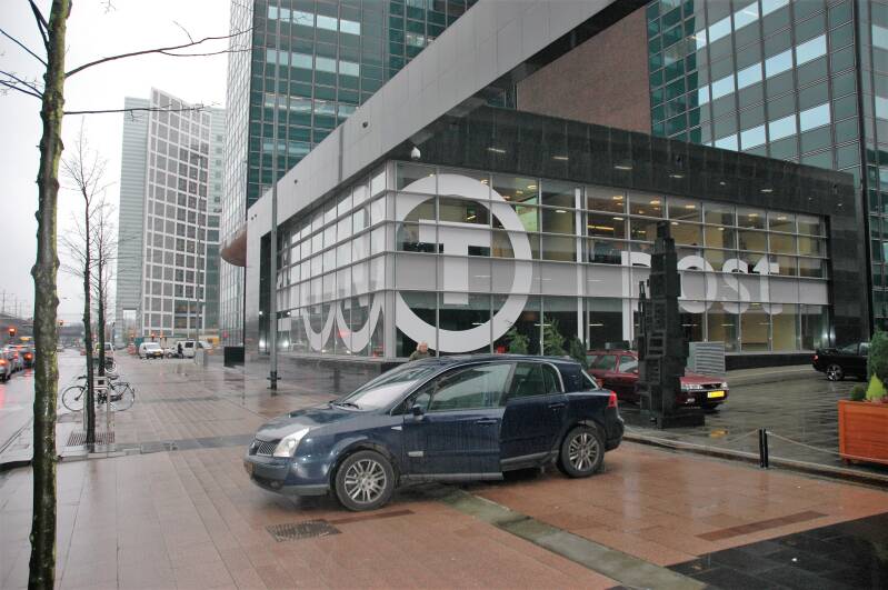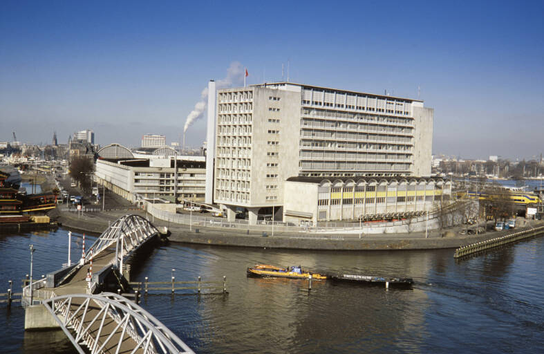 Boven het AA-gebouw in Den Haag, herkenbaar in de TNT Post-periode. Zicht vanaf station Den Haag Centraal. Daaronder Voorlinden, het voormalige opleidingsinstituut voor Hoger Personeel. Onder: Het imposante gebouw aan Oostdokskade in Amsterdam. Welgelegen aan het IJ.