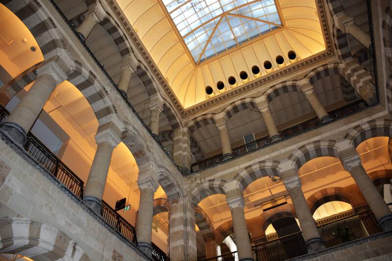 Links: imposante blik op de binnenkant van het winkelcentrum Magna Plaza