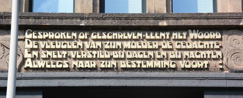 Boven de hoofdingang van het hoofdkantoor van de PTT aan de Kortenaerkade in Den Haag was bovenstaand opschrift aangebracht.