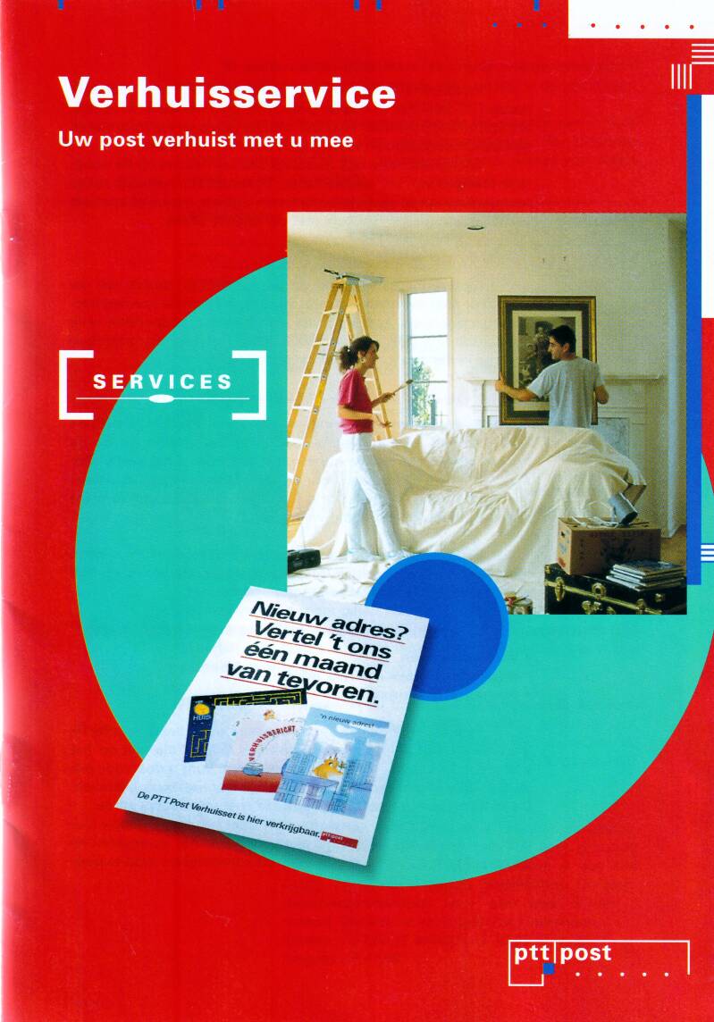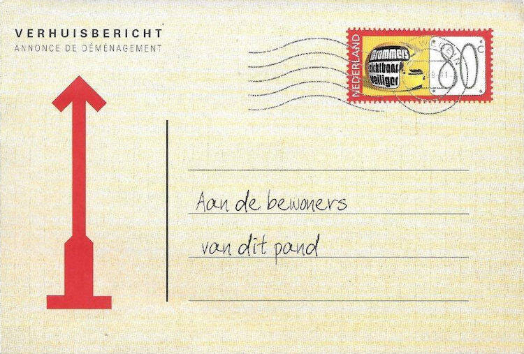 Boven: verhuisbericht sturen per briefkaart - of digitaal het bericht doorgeven. Onder: de verpakking van het mapje waarin alle informatie zat.