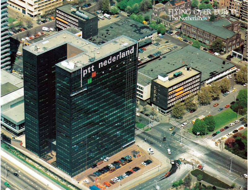 In het gebouw links, officiëel genaamd AA, inofficiëel algenbak aan de Beatrixlaan 23 bracht Hennie de meeste van zijn werkzame jaren door