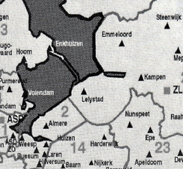 Boven een stukje van de expeditiekaart uit 1968. Emmeloord was een serieus kantoor. Het hele gebied viel onder het uitgangsgebied Zwolle. In 1994 werden er rayons gevormd (rechtsboven). Lelystad en Emmeloord vielen onder de Regio NO, nu werd dat Rayon Zwolle, het ZO-deel onder Rayon Centrum en Almere werd een eigen Rayon.