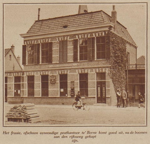 In Borne komen we een Rijkmonument tegen. In 1884 gaf de gemeente Borne opdracht tot de bouw van een postkantoor in neo-Renaissance stijl aan de Grotestraat 144. Architect J.H. Scholten Azn. uit Almelo maakte het ontwerp. Bij Koninklijk Besluit van 13 juni 1884 werd bepaald dat dit een hoofdpostkantoor zou worden 14) .Op 1 oktober van dat jaar trad een directeur aan (afkomstig uit Ootmarsum) en was de officiële start.