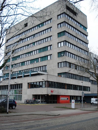 Links: Het postkantoor aan de Westdorplaan met helemaal links op de foto het kunstwerk dat verdween in de shredder