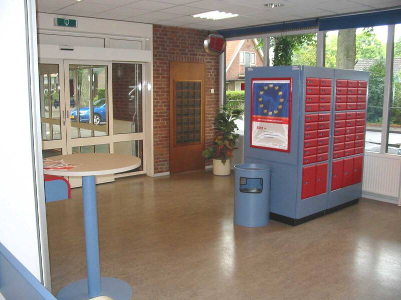 Boven: Nunspeet, klantruimte met postbussenfront