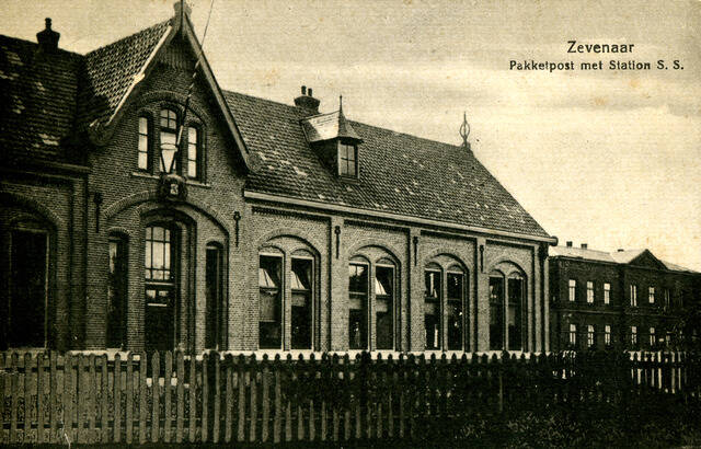 Rechts: Pakketpost met station van de Staats Spoorwegen. Zevenaar was een inklaringskantoor voor het verkeer uit Duitsland